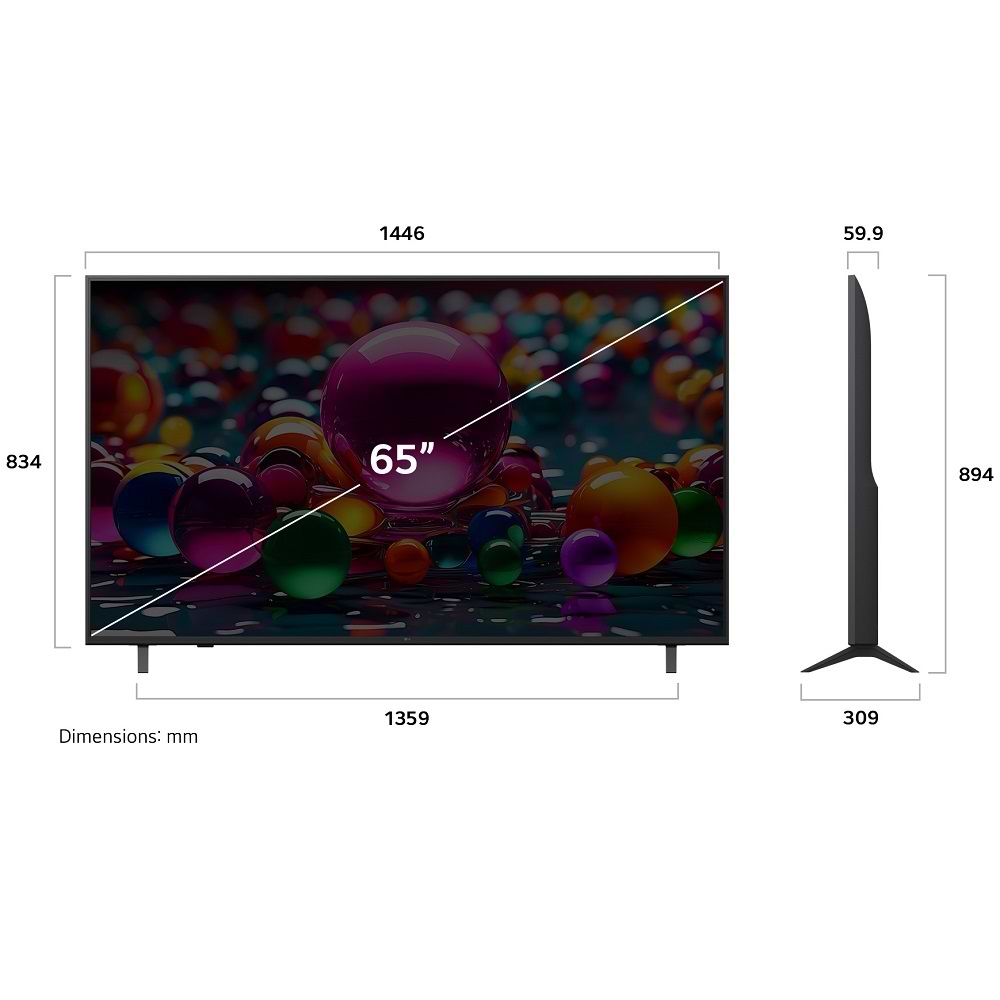הדגם מציע מסך 65 אינץ’ עם מעבד α7 AI 4K דור 8 לשדרוג תמונה וסאונד, HDR10 Pro לתמונה דרמטית ותמיכה מלאה ב־ThinQ AI.